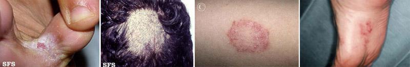 As infecções por dermatofitos podem se manifestar de muitas maneiras. As infecções na face e couro cabeludo são denominadas tinea capitis; no corpo, tinea corporis; nas virilhas, tinea cruris e nos pés, tinea pedis. A mais comum é a tinea pedis, variando de 25 a 70%. A apresentação clinica varia. No couro cabeludo, apresentam-se como placas escamosas acinzentadas acompanhadas de perda de cabelo no local. No corpo, como placa eritematosa, bem definida, com bordas elevadas, mas nos atletas pode se apresentar como uma placa irregular. A tinea corporis é mais comum na cabeça, pescoço, tronco e braços. Na região inguinal, caracteriza-se por placa eritematosa e nos pés, por descamação fina, principalmente nas plantas e entre os dedos, estendendo-se para as margens laterais dos pés.
