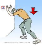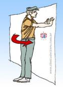 6 - De costas para uma parede e os pés ligeiramente afastados dela e entre eles, rode o tronco e apóie as duas mãos na parede.
