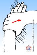 1. Coloque a palma da mão sobre uma mesa, fixando o cotovelo corra a outra mão como na figura;