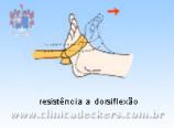 Segurar as pontas da faixa com ambas as mãos e, suavemente, empurrar o pé para baixo apontando os dedos do pé para frente, tencionando a faixa terapêutica (thera band), como se estivesse acelerando o pedal de um carro.