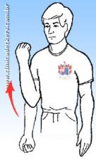 Com a palma da mão para frente, flexionar e estender o cotovelo, 10 vezes, relaxar e repetir 3 vezes.