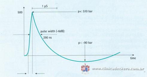 A energia E da onda de choque é determinada pela amplitude da pressão e, sua duração, pela sua propriedade acústica central (densidade e velocidade sônica) e pela propagação espacial da onda de choque.
