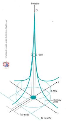 Além do Foco 5 MPa, outra área importante a ser definida é chamada de Foco -6dB. A característica desta área é o fato de que está exatamente na região central da onda, ou seja, na metade do pico de onda de choque. A energia aplicada a esta área é chamada de E+(-6dB) e sua amplitude de pico bem como seu diâmetro também dependerão da energia que está sendo aplicada no equipamento.