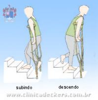 Subindo: aproxime-se das escadas. Suba o degrau com a perna boa, depois traga as muletas e a perna lesionada para o degrau de cima onde esta a perna boa. Repita.