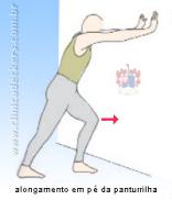 Manter o lado lesionado estendido, com o calcanhar no chão, e inclinar-se contra a parede.
