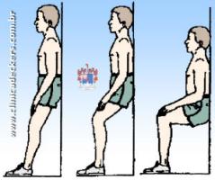 Com o tronco encostado em uma parede e os pés afastados, cerca de 10 cm, entre si e da parede, agachar lenta e moderadamente, manter 10 segundos e levantar;