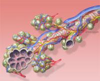 A difusão é feita nos alvéolos: o oxigênio é difundido do ar para o sangue e o gás carbônico do sangue para o ar.