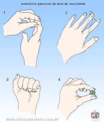 Flexionar os dedos, fechando o punho. Se o dedo lesionado não dobrar até o punho, auxilie-o a dobrar, com a mão não lesionada.