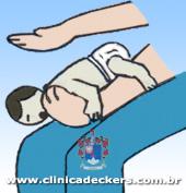 Se a manobra não surtir efeito, vire o bebê para frente e com dois dedos faça quatro compressões firmes no tórax, logo abaixo dos mamilos.