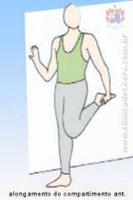 Manter o lado lesionado estendido, com o calcanhar no chão, e inclinar-se contra a parede.
